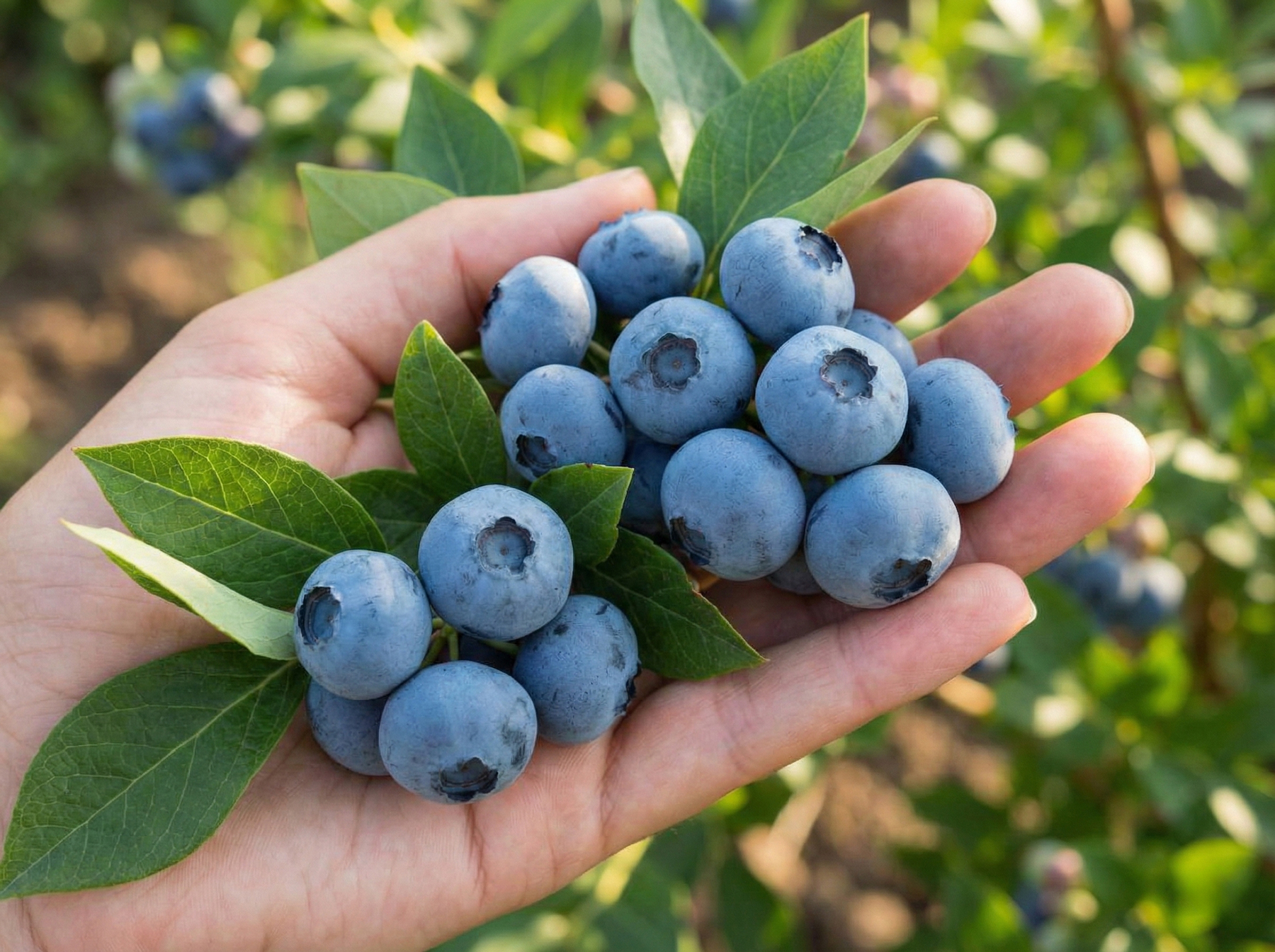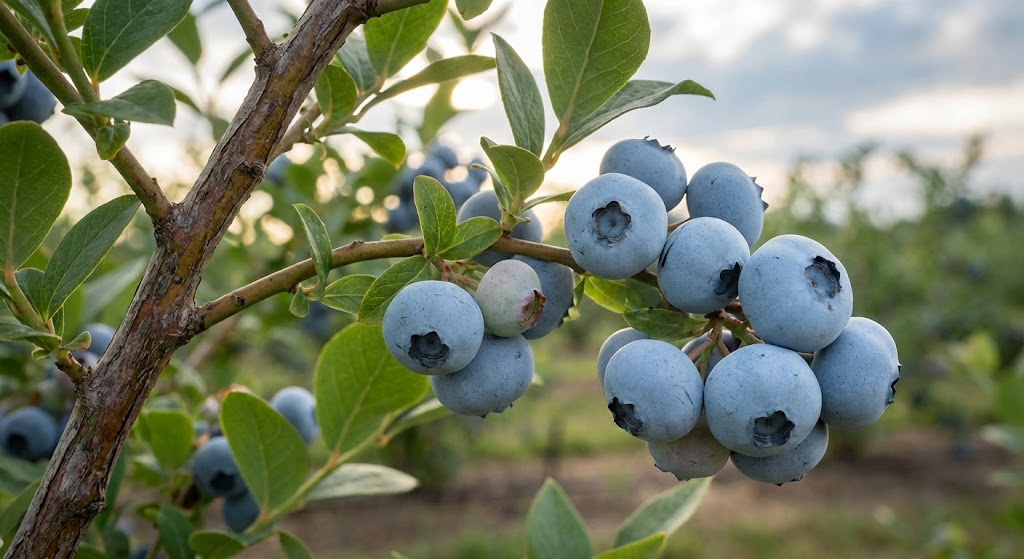 Borówka amerykańska Chandler (Vaccinium corymbosum) to odmiana, która potrafi skraść uwagę już samym wyglądem – na tle soczyście zielonych liści dojrzewają okazałe, granatowo‑fioletowe owoce z delikatnym, jasnym nalotem. Na krzewie prezentują się niezwykle apetycznie, tworząc dorodne grona, które aż proszą się o zerwanie prosto do miseczki. To świetny wybór dla osób, które chcą połączyć przyjemność z domowych zbiorów z dekoracyjnym akcentem w ogrodzie.