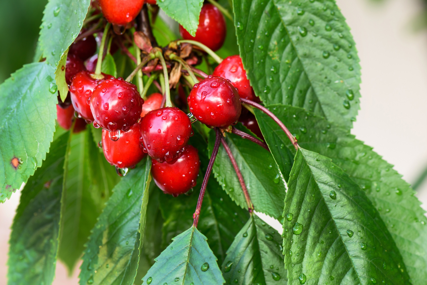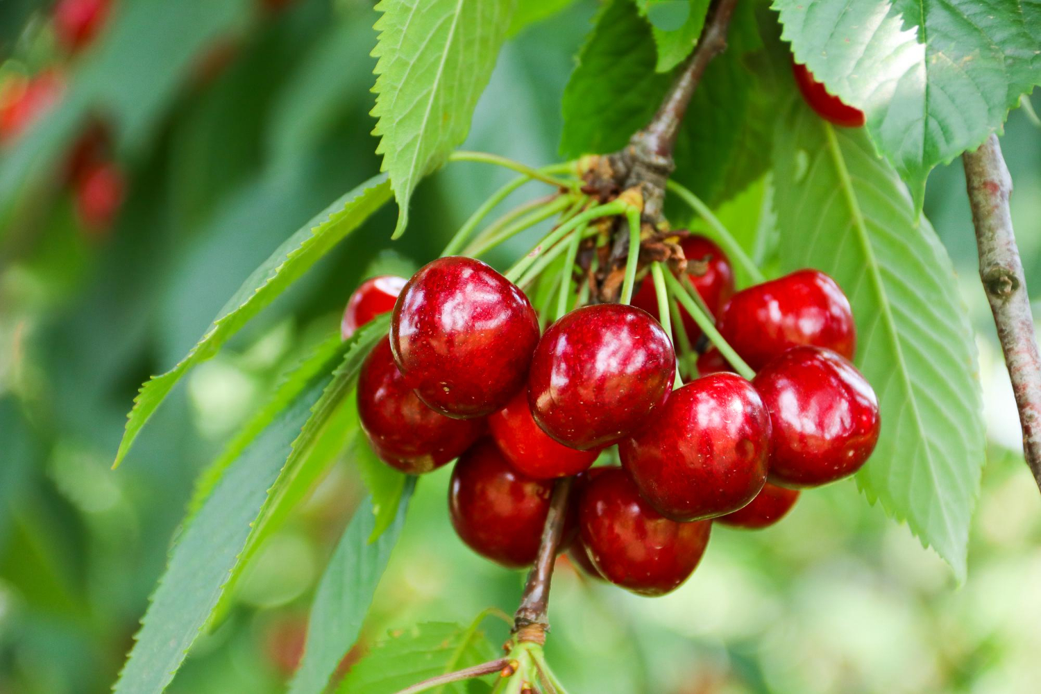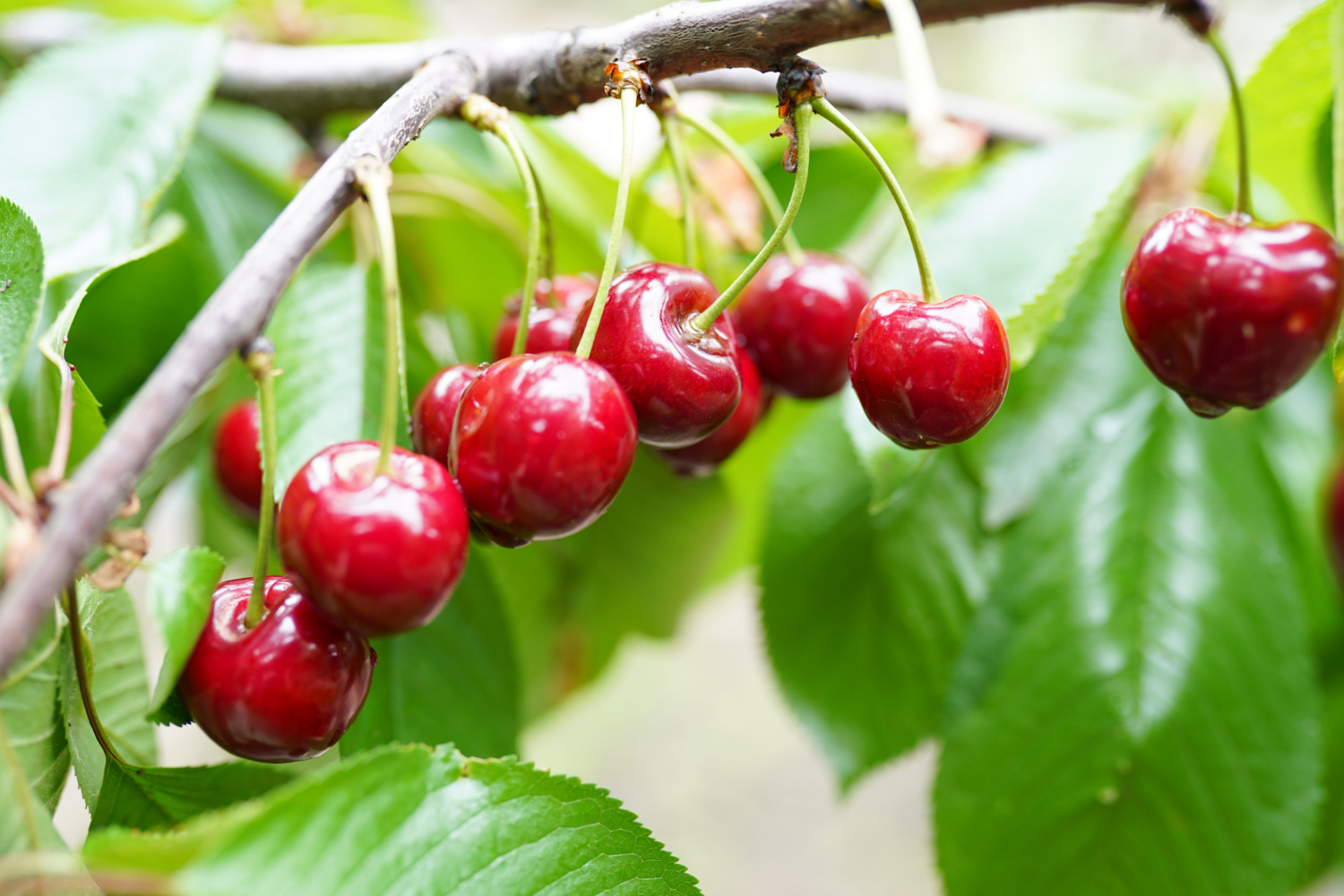 Aksamitnie słodka i wyrazista – Czereśnia Wanda (Prunus avium 'Wanda’) zachwyca dużymi, okrągłymi owocami o rubinowej barwie i chrupkim, soczystym miąższu. Zebrane w dorodne grona na długich szypułkach pięknie kontrastują z połyskującymi, zielonymi liśćmi; po deszczu błyszczą jak biżuteria, natychmiast zdobiąc ogród.