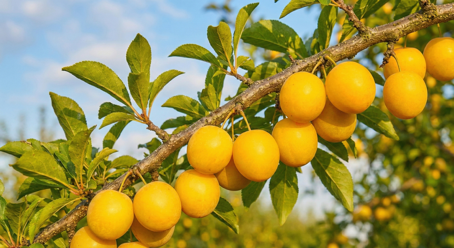 Śliwa mirabela żółta (Prunus domestica subsp. syriaca) to prawdziwy promień słońca w ogrodzie – zachwyca urodą i obietnicą owoców, które kojarzą się z domowym latem. Jej **złociste śliwki** pięknie prezentują się na tle liści, a dekoracyjne, obficie owocujące gałązki sprawiają, że roślina cieszy oko zarówno w sadzie, jak i w bardziej ozdobnych zakątkach ogrodu.