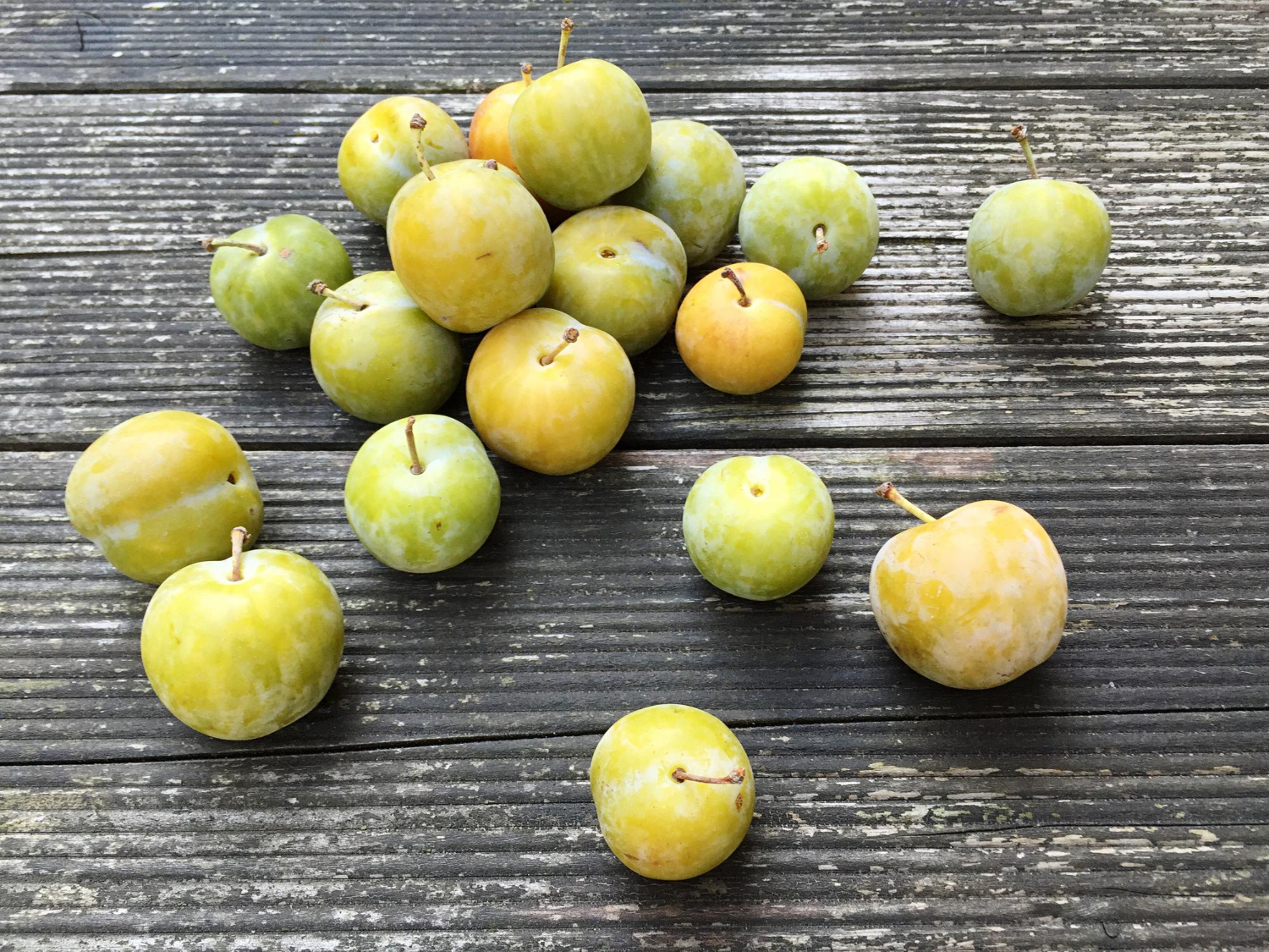 Śliwa Rengloda Ulena (Prunus domestica) to klasyczna, deserowa piękność. Owoce na zdjęciu — kuliste, żółtozielone, z delikatnym woskowym nalotem i złotym muśnięciem — zachwycają elegancją. Wiosną drzewko obsypuje się kwiatami, latem tworzy zgrabną, dekoracyjną sylwetkę.