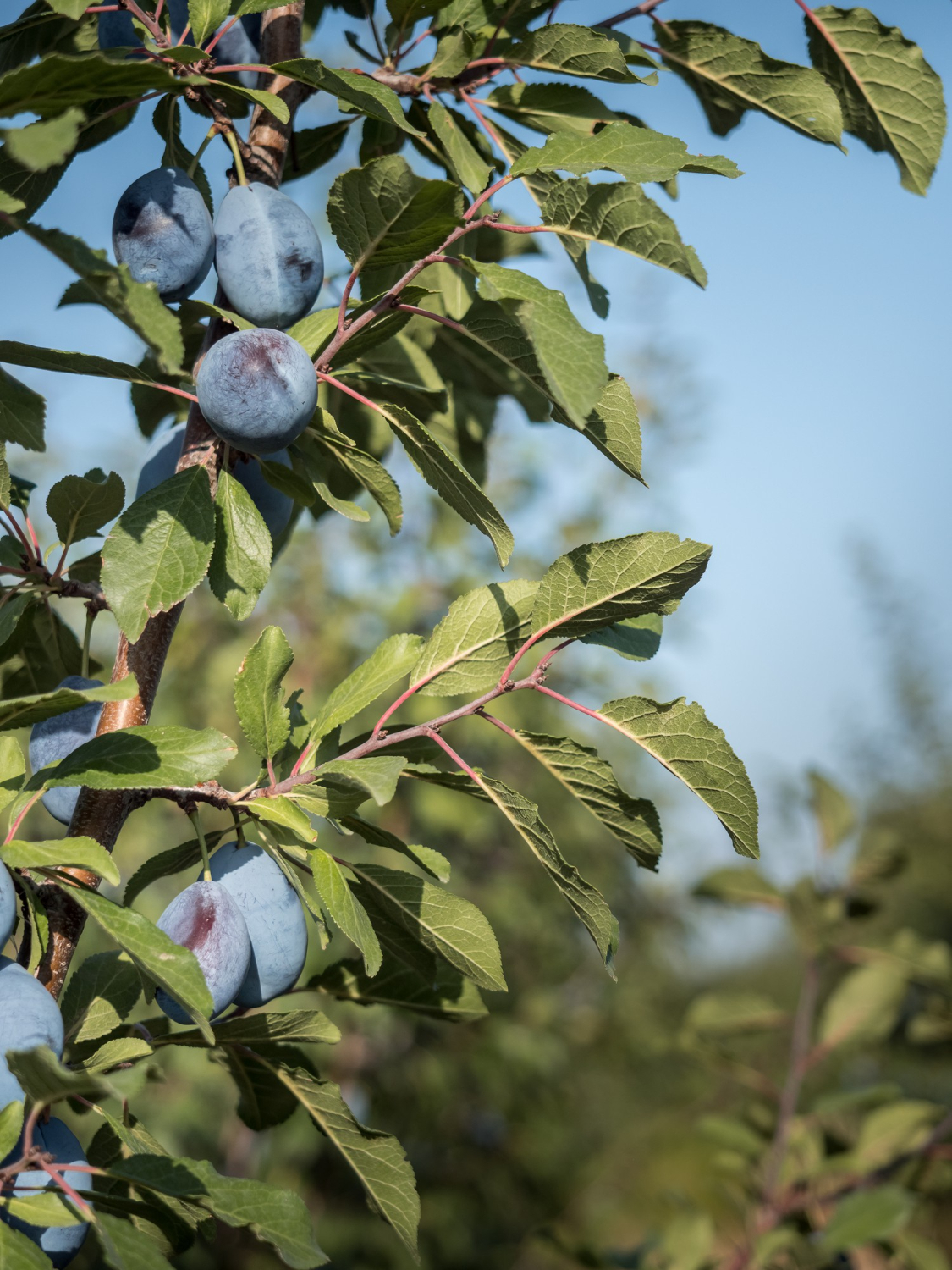 Śliwa Węgierka Zwykła (Prunus domestica) to klasyka polskich ogrodów. Na smukłych gałązkach dojrzewają granatowe, lekko wydłużone owoce z jasnym, woskowym nalotem, które pięknie kontrastują z soczystą zielenią liści. W sezonie owocowania drzewko wygląda zjawiskowo i przyciąga wzrok.